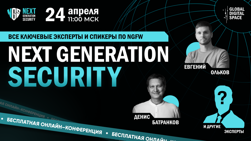 Next Generation Security 2026 — онлайн-конференция от Global Digital Space для тех, кому важно знать, что на самом деле происходит с отечественными NGFW. Не по маркетинговым материалам — а по опыту тех, кто внедряет, эксплуатирует и ломает эти решения каждый день.