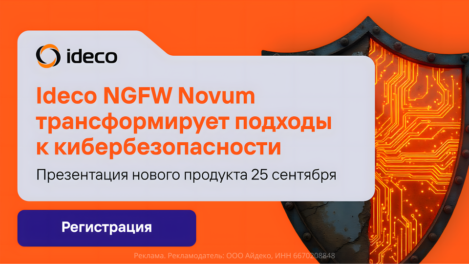 25 сентября в 11:00 (Мск) компания проведет прямой эфир, посвященный Ideco NGFW Novum: продукту с максимальной производительностью и интеграцией под задачи enterprise.